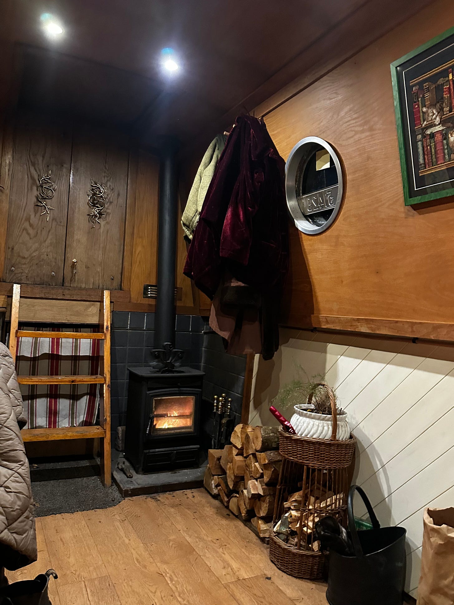 Trundling down the canal path by torchlight in the lashing rain. Hunkering down in my friend’s narrowboat with cups of cocoa. Reading poetry to each other by the glow of the fire.