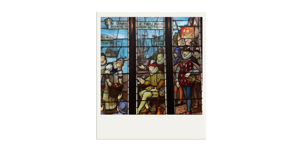 The pub’s delightful stained glass window rivals that of any cathedral. Dating back to 1888, it depicts the ships of Fowey preparing to welcome the Spanish Armada. It was salvaged from a skip still intact in the 1960s and lovingly installed in the Ship’s dining room.